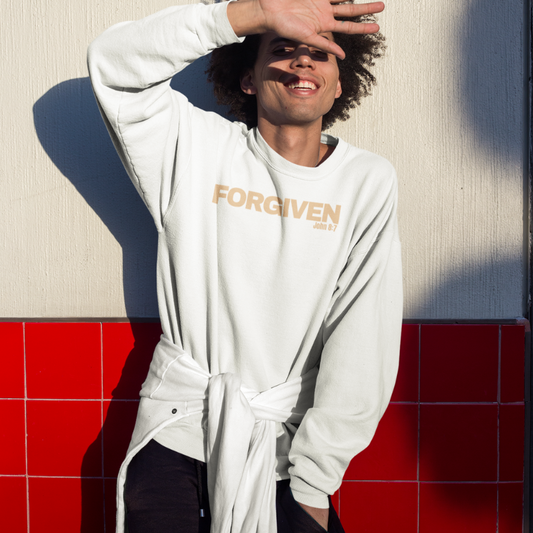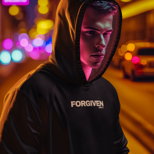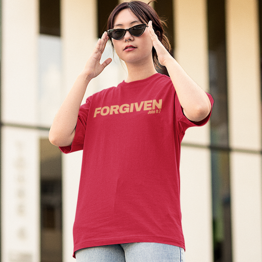 Both garments adorn the same graphic elements. The word forgiven in all caps with a period at the end to represent it is done. The scripture citation John 8:7 is on the back of each garment below the neck. Each garment is made with luxuriously soft cotton, and launders well.
