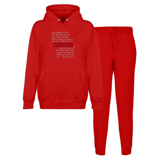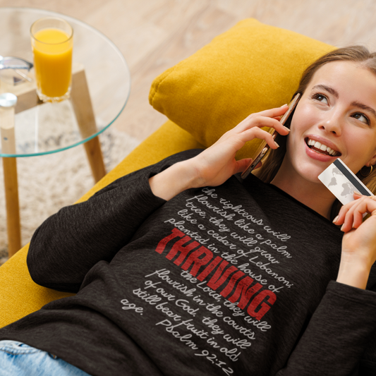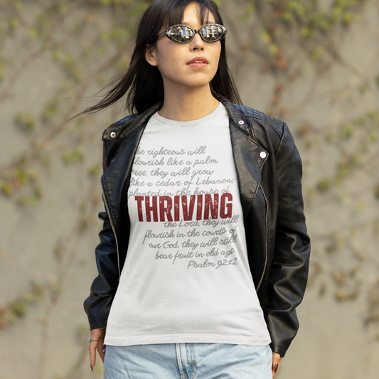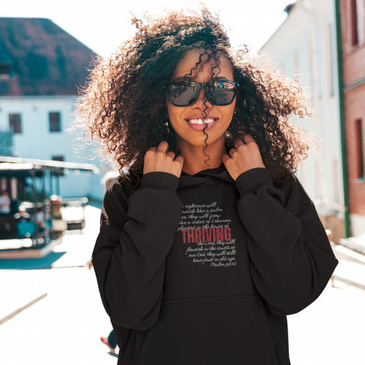 Both garments adorn the same graphic elements, a soft font on the bottom layer for the scripture and bold red letters on the top. The bold red letters draw attention to the eye quickly. The scripture reference is on the back of each garment below the neck. Each garment is made with luxuriously soft cotton, and can be machine washed.