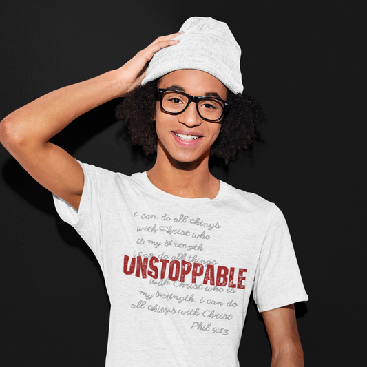 Both garments adorn the same graphic elements, a soft font on the bottom layer for the scripture and bold red letters on the top. The bold red letters draw attention to the eye quickly. The scripture citation Philippians 4:13 is on the back of each garment below the neck. Each garment is made with luxuriously soft cotton, and can be machine washed.